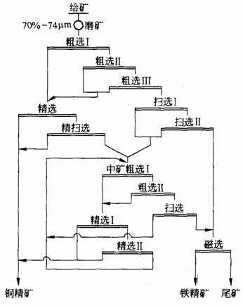礦石的氧化礦由于含銅鐵都較高,氧化程度深且含泥量大,銅的結(jié)合率又高,采用單一浮選機(jī)浮選藥劑消耗量大且選擇性差,難以獲得滿意的結(jié)果。其基本流程如圖1所示。礦石在常溫下硫化后浮選銅礦物,浮選尾礦用磁選鐵設(shè)備選鐵精礦。其指標(biāo)為:銅精礦含銅18.10%;銅回收率89.10%。鐵精礦含鐵66.80%;鐵回收率65.30%。