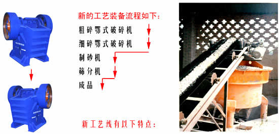 ① 粗碎鄂式破碎機(jī)采用GFP系列負(fù)支撐鄂式破碎機(jī),其鄂板壽命是PE系列鄂式破碎機(jī)的6倍以上; ② 制砂機(jī)是目前國標(biāo)上破碎磨蝕物料的首選設(shè)備,采用石打石的破碎原理;其顯著的特點(diǎn)是破碎效率高、金屬消耗低。 3、新工藝采用干法生產(chǎn); 4、新工藝線產(chǎn)品細(xì)粉含量符合浮法玻璃生產(chǎn)工藝要求,新工藝線可用于砂巖、石英巖、硅石、長石的破碎,在碎玻璃的再破碎上也取得了很理想的效果。